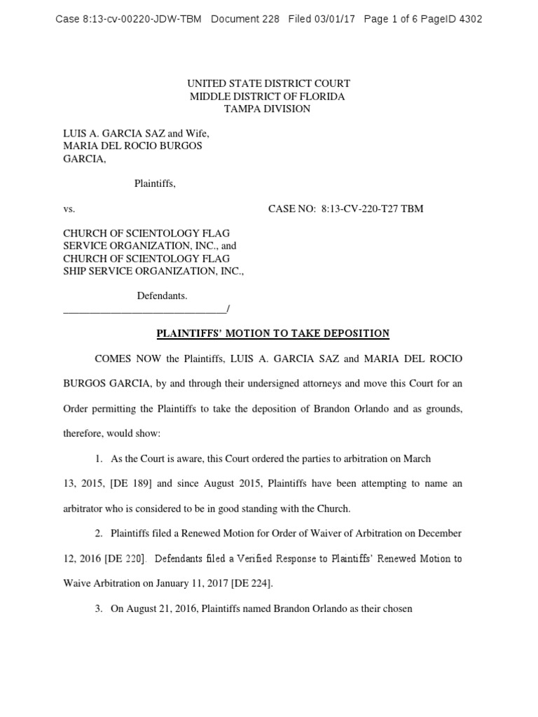 UNITED STATE DISTRICT COURT MIDDLE DISTRICT OF FLORIDA TAMPA DIVISION LUIS A. GARCIA SAZ and Wife, MARIA DEL ROCIO BURGOS GARCIA, Plaintiffs, vs. CHURCH OF SCIENTOLOGY FLAG SERVICE ORGANIZATION, INC., and CHURCH OF SCIENTOLOGY FLAG SHIP SERVICE ORGANIZATION, INC., Defendants. _______________________________/ CASE NO: 8:13-CV-220-T27 TBM