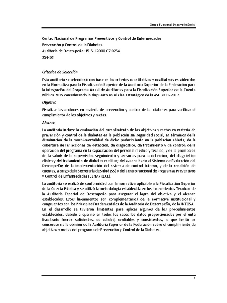 Fiscalizar las acciones en materia de prevencin y control de la diabetes para verificar el