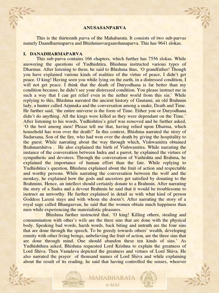 This is the thirteenth parva of the Mahabarata. It consists of two sub-parvas