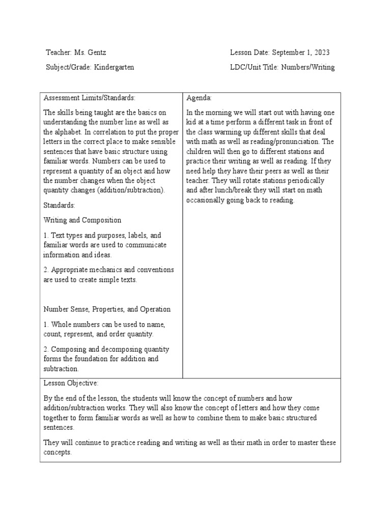 Subject/Grade: Kindergarten LDC/Unit Title: Numbers/Writing