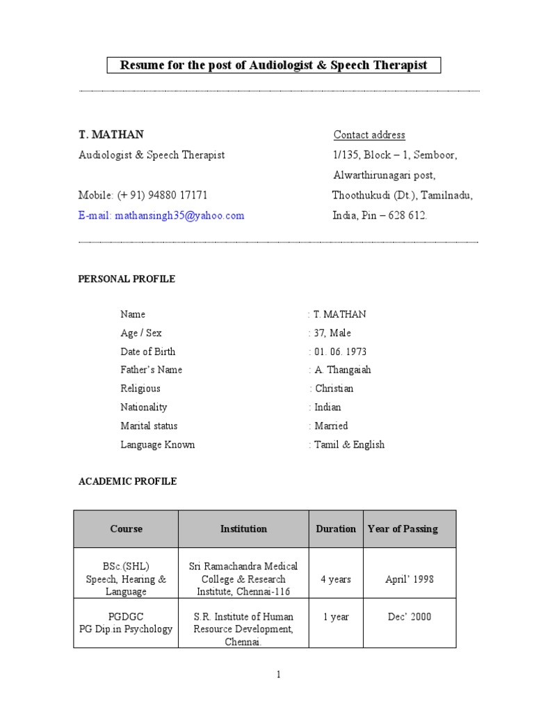 /ma/ Speech & Hearing clinic, Nagercoil (June’2007 – Jan’2009).