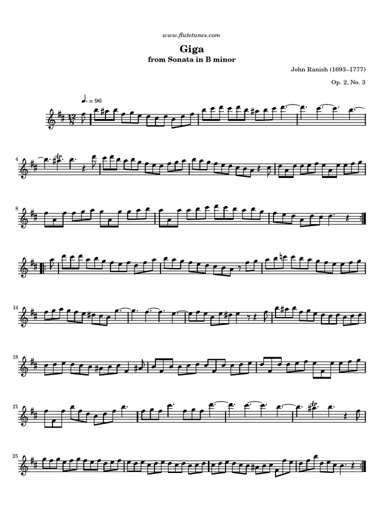 This document is a musical score for the "Giga" movement from John Ranish's Sonata in B minor, Op. 2, No. 3. The piece is in 4/4 time and should be played at a tempo of 96 beats per minute. The score provides musical notation across 28 measures for a solo flute or other woodwind instrument.