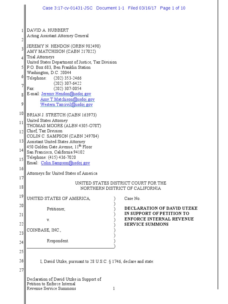 Declaration of David Utzke in Support of Petition to Enforce Internal Revenue Service Summons 2 1 2 3 4 5 6 7 8 9 10 11 12 13 14 15 16 17 18 19 20 21 22 23 24 25 26 27 1.