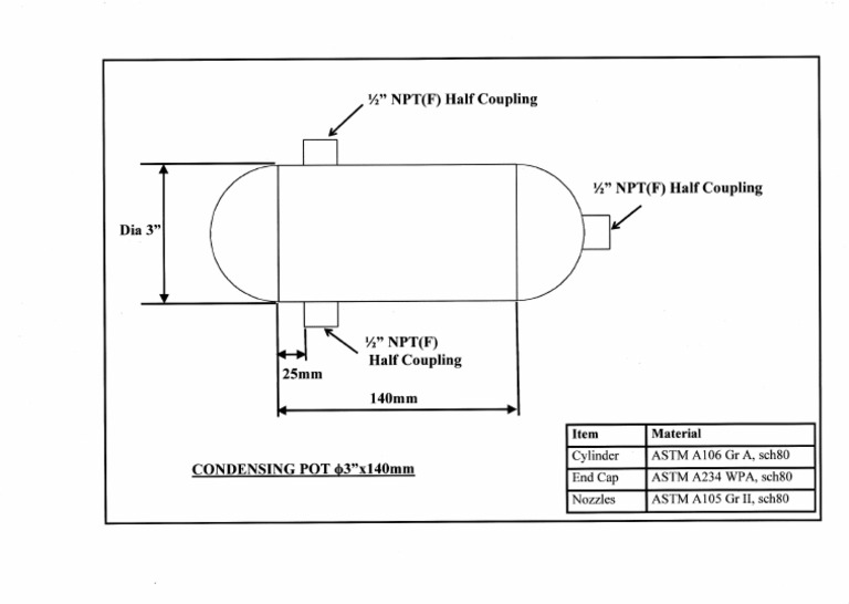 This document provides specifications for a condensing pot that is 3 inches in diameter and 140mm long. The condensing pot is made of ASTM A106 Grade A schedule 80 steel for the cylinder and ASTM A234 WPA schedule 80 steel for the end caps. The nozzles are made from ASTM A105 Grade II schedule 80 steel.