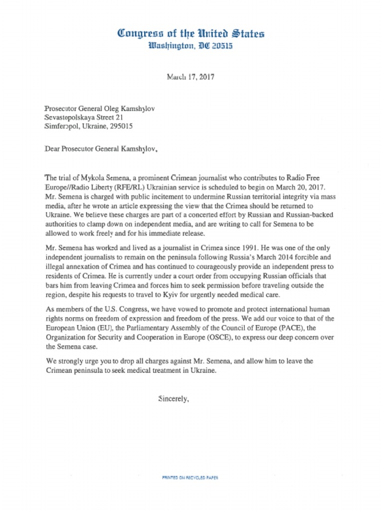 Members of the U.S. Congress Call to Drop Criminal Charges Against Crimean Journalist Mykola Semena