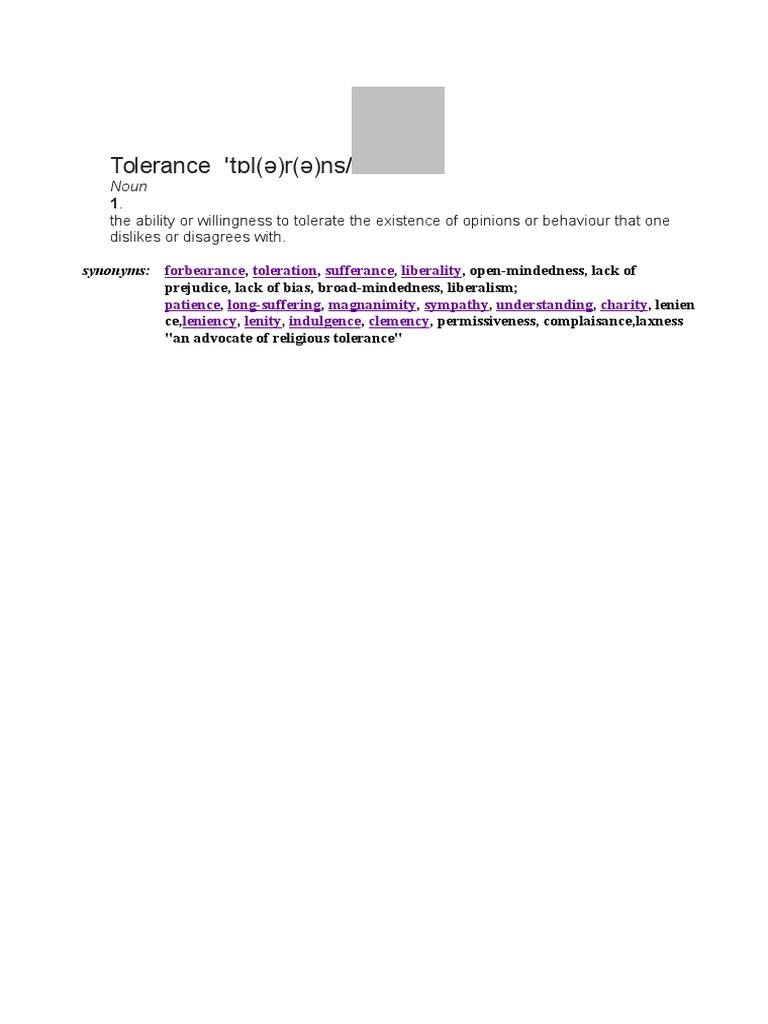 synonyms: forbearance, toleration, sufferance, liberality, open-mindedness, lack of