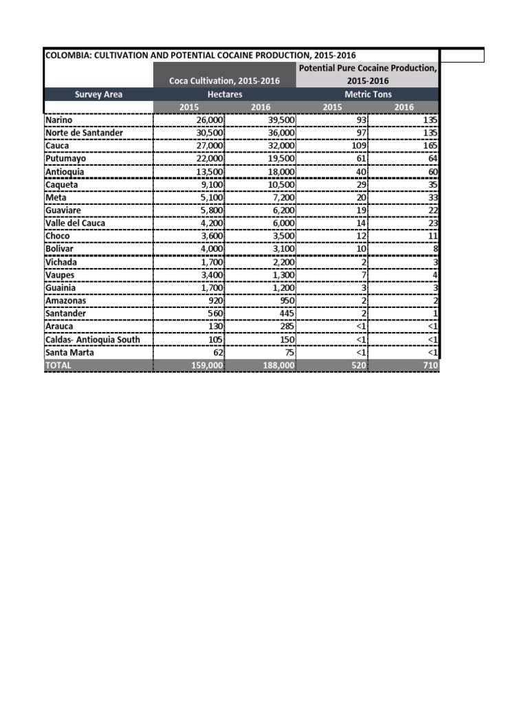 The document reports on coca cultivation and potential cocaine production in Colombia for 2015-2016. Coca cultivation increased in most areas surveyed with the largest increases in Narino, Norte de Santander, Cauca, and Antioquia. Potential pure cocaine production also increased nationwide over the two year period.