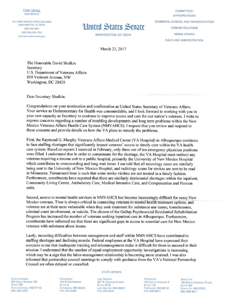 Udall Letter Calling on VA to Provide Veterans the Quality, Timely Health Care They Have Earned