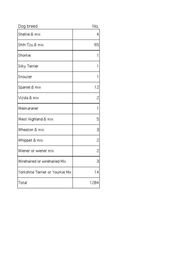 This document provides a count of different dog breeds and mixes housed at an animal shelter. The top three breeds represented are Shih-Tzu & mix with 65, Yorkshite Terrier or Yourkie Mix with 14, and Spaniel & mix with 12. In total, the shelter housed 1284 dogs of various breeds and mixes.