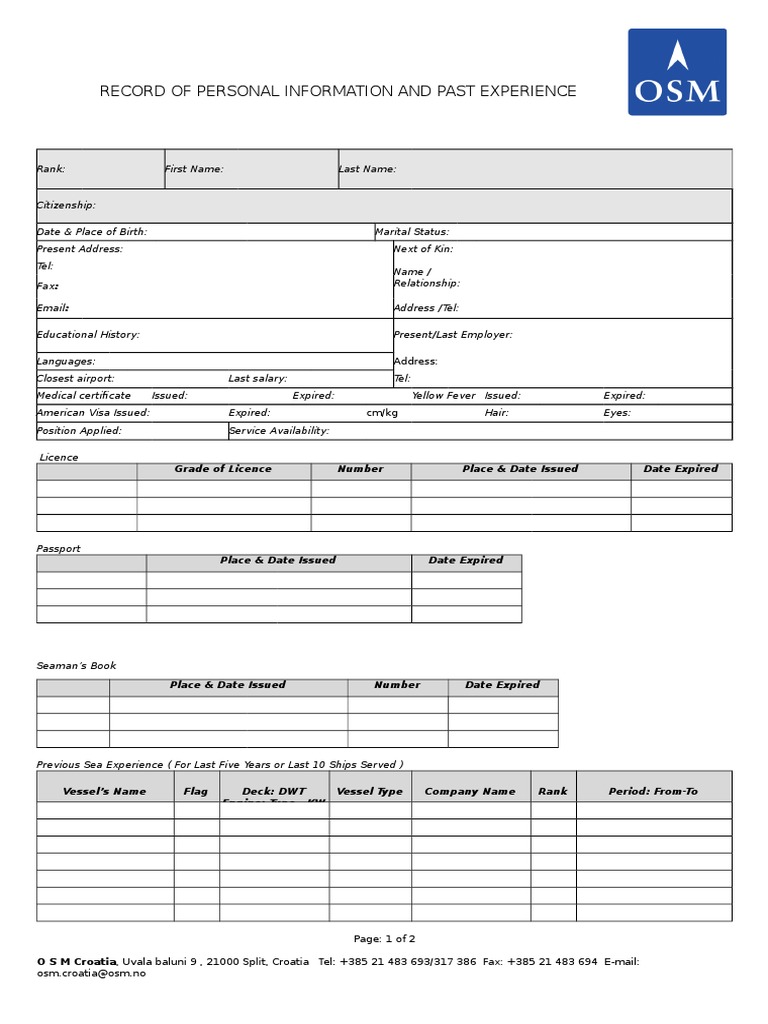 RECORD OF PERSONAL INFORMATION AND PAST EXPERIENCE