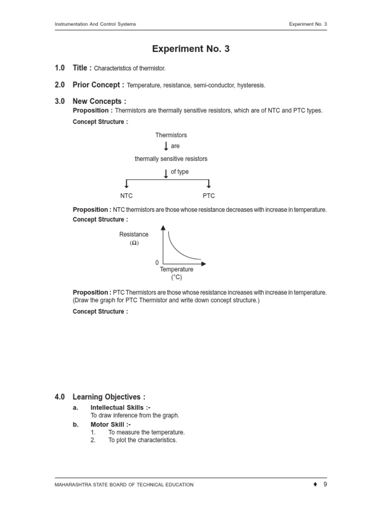9. While heating 2. Mention the different ranges of Thermistor based on shapes. On the basis of observations state whether Thermistor is a linear or nonlinear transducer. 3. What is the contact and lead resistance problem? 13.Instrumentation And Control Systems Experiment No. 12. What are the two basic types of Thermistor? 6. 7. MAHARASHTRA STATE BOARD OF TECHNICAL EDUCATION ♦ 11 . Justify the answer. No. Temperature ( 0C ) Heating Cooling 1 Room temperature 2 35 3 40 4 45 5 50 6 55 7 60 8 65 9 70 10 75 11 80 12 85 13 90 14 95 15 BP water (100°C) 7.0 Questions : ( Attempt 3-5 questions as directed by the teacher) 1. probe. Comments on the obtained value of β with specification sheet. disk. Which materials are used for preparing the Thermistor? 10. 2. Draw sketch of bead. while cooling 8. Give two applications of Thermistor. rod type thermistor. based on shape. What are the different ways to excite thermistor? 11. What is the maximum value of Thermistor resistance in the experiment? 5. 3 OBSERVATION TABLE Resistance Sr. State whether cold junction compensation is needed for thermistor. Mention the type of Thermistor used.0 Conclusion : Comment on the nature of the graph and hysteresis of the curve 9.0 Result : Value of β 1. 8. 4. Differentiate between Thermistor and RTD on the basis of principle.