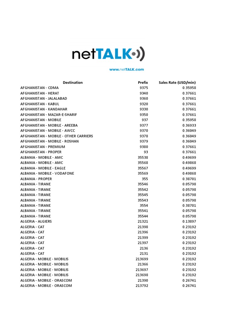 Destination Prefix Sales Rate (USD/min)