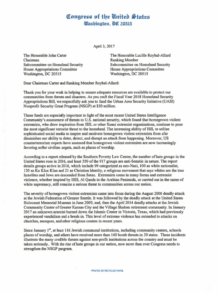 Bipartisan letter urges $50 million allocation for Homeland Security grant to protect vulnerable non-profit facilities