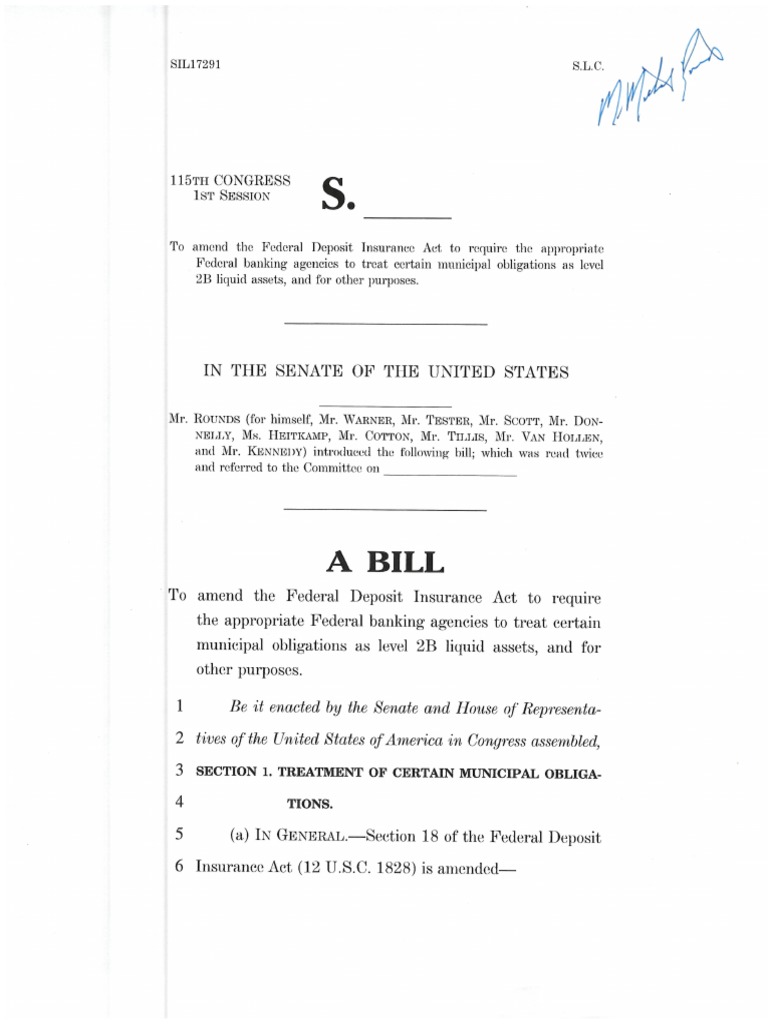 U.S. Sens. Mark R. Warner (D-VA) and Mike Rounds (R-SD), members of the Senate Banking Committee, today re-introduced bipartisan legislation to allow high quality municipal debt to be classi…
