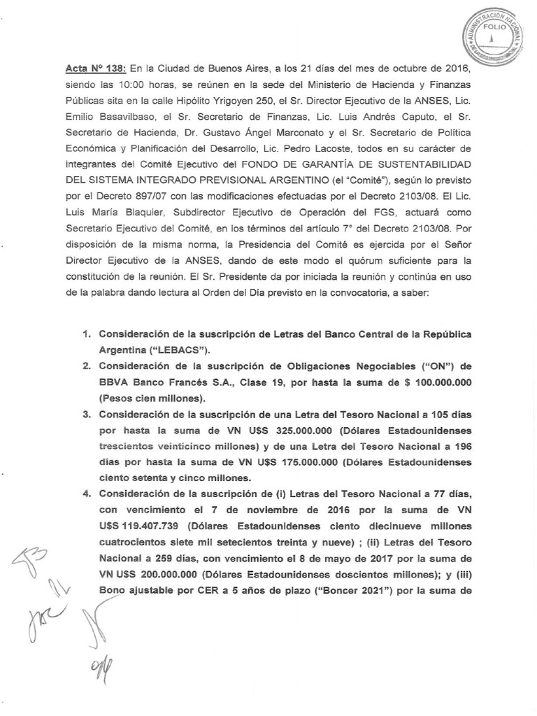 2016 el FGS ha suscripto VN USS 325.000.000 de una Letra del Tesoro Nacional a 105