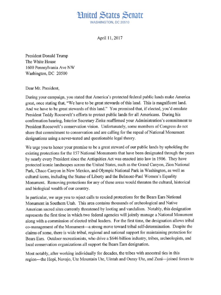 U.S. Senator Tom Udall led a group of Western Democratic senators in calling on President Donald Trump to live up to his repeated promises on the campaign trail to protect public lands for all Americans and uphold the existing protections for the 157 national monuments, which have been designated throughout the decades by nearly every U.S. president of the last century.
