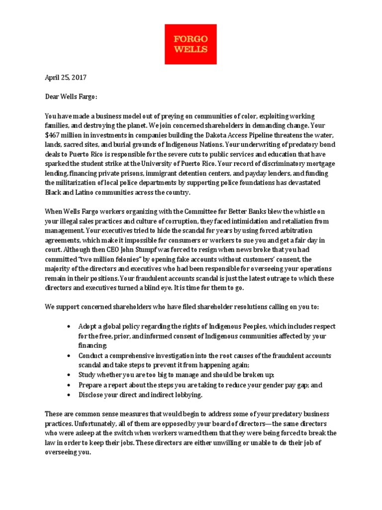 April 25, 2017 Dear Wells Fargo: You have made a business model out of preying on communities of color, exploiting working families, and destroying the planet. We join concerned shareholders in demanding change. Your $467 million in investments in companies building the Dakota Access Pipeline threatens the water, lands, sacred sites, and burial grounds of Indigenous Nations. Your underwriting of predatory bond deals to Puerto Rico is responsible for the severe cuts to public services and education that have sparked the student strike at the University of Puerto Rico. Your record of discriminatory mortgage lending, financing private prisons, immigrant detention centers, and payday lenders, and funding the militarization of local police departments by supporting police foundations has devastated Black and Latino communities across the country. When Wells Fargo workers organizing with the Committee for Better Banks blew the whistle on your illegal sales practices and culture of corruption, they faced intimidation and retaliation from management. Your executives tried to hide the scandal for years by using forced arbitration agreements, which make it impossible for consumers or workers to sue you and get a fair day in court. Although then CEO John Stumpf was forced to resign when news broke that you had