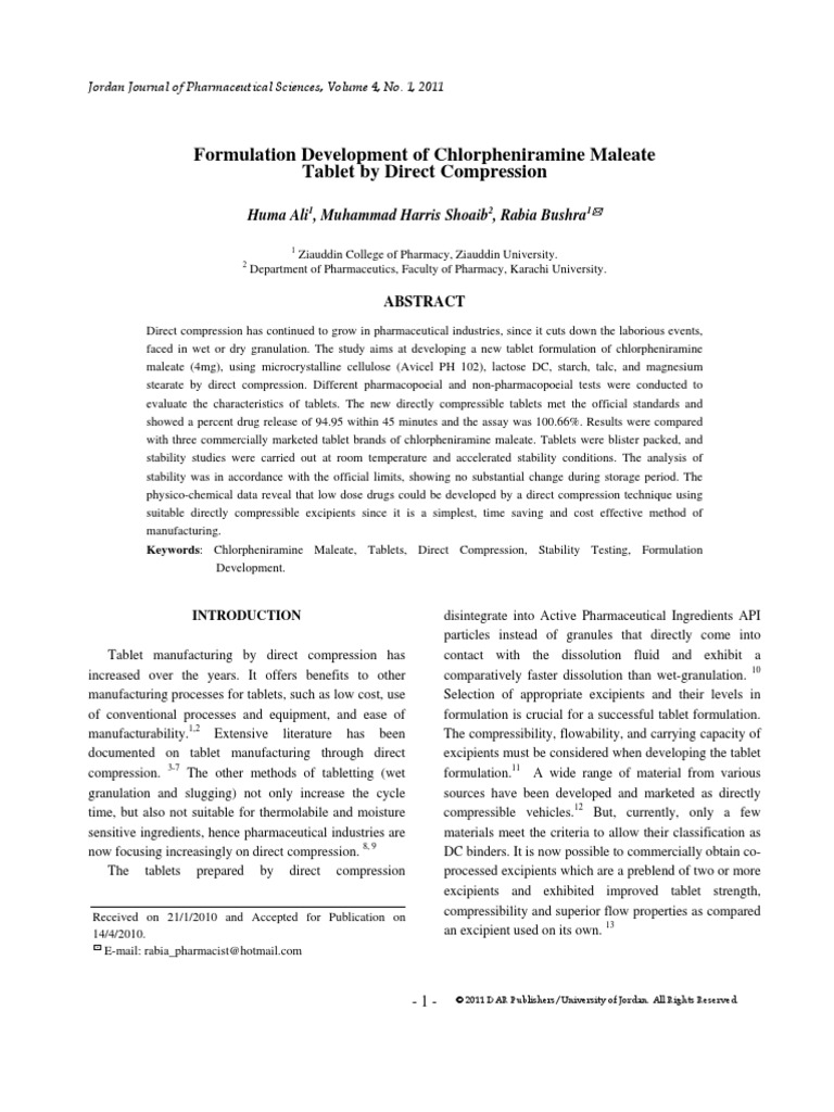 Keywords: Chlorpheniramine Maleate, Tablets, Direct Compression, Stability Testing, Formulation
