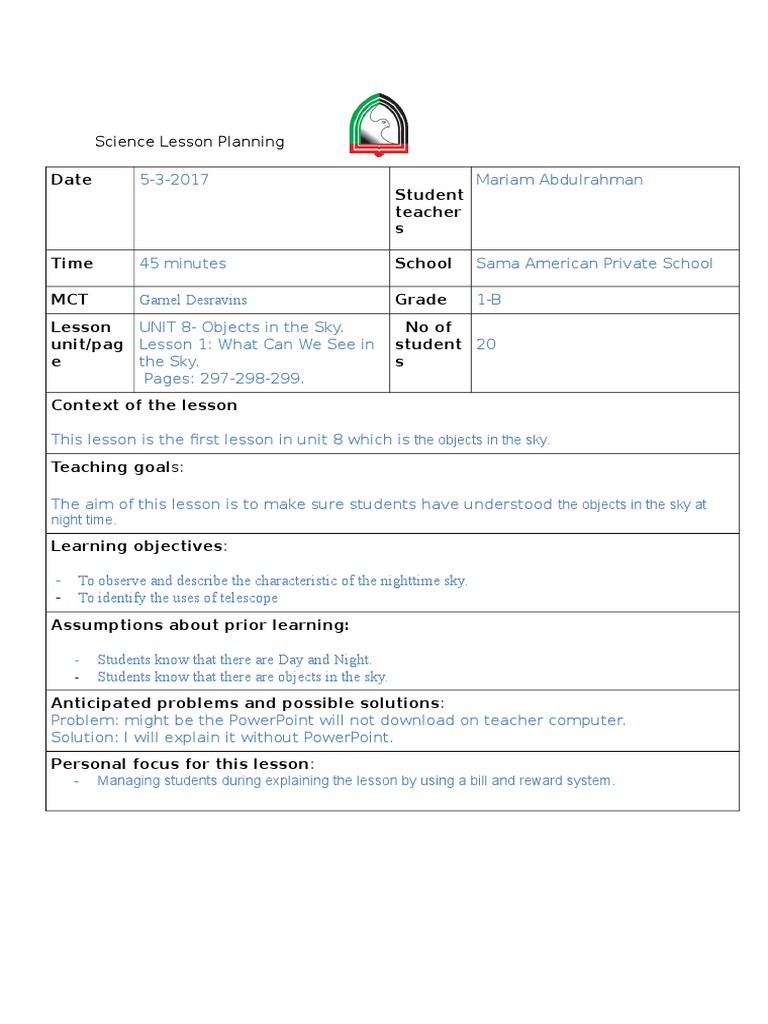 This lesson is the first lesson in unit 8 which is the objects in the sky.