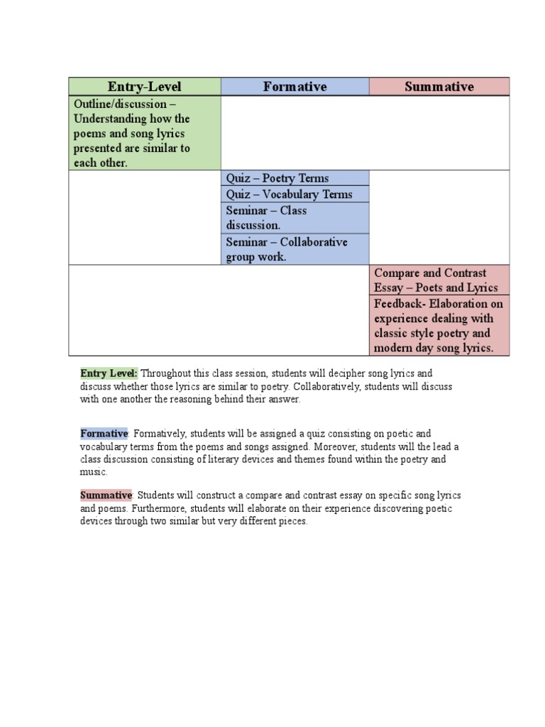 Summative: Students will construct a compare and contrast essay on specific song lyrics