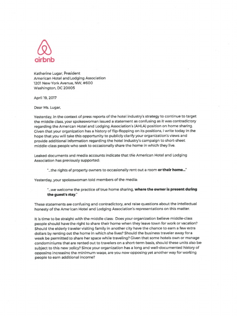 regarding the Amercan Hotel and Lodging Association's (HLA) position on nome sharing.