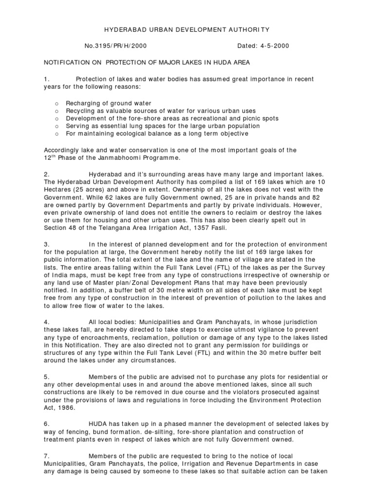 NOTIFICATION ON PROTECTION OF MAJOR LAKES IN HUDA AREA