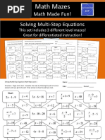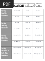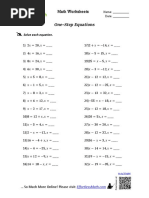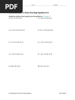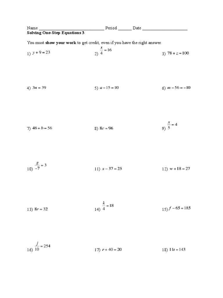This document is a worksheet for solving one-step equations with 15 problems numbered 1 through 15. It instructs students to show their work to receive credit even if they have the correct answer and contains blanks for students to write the equation, show their work, and provide the solution for each problem.