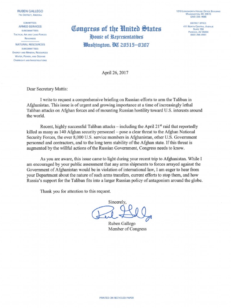 Congressman Ruben Gallego, a Member of the House Armed Services Committee, wrote to Defense Secretary James Mattis seeking more information about Russian aid to the Taliban in Afghanistan. H…Full description