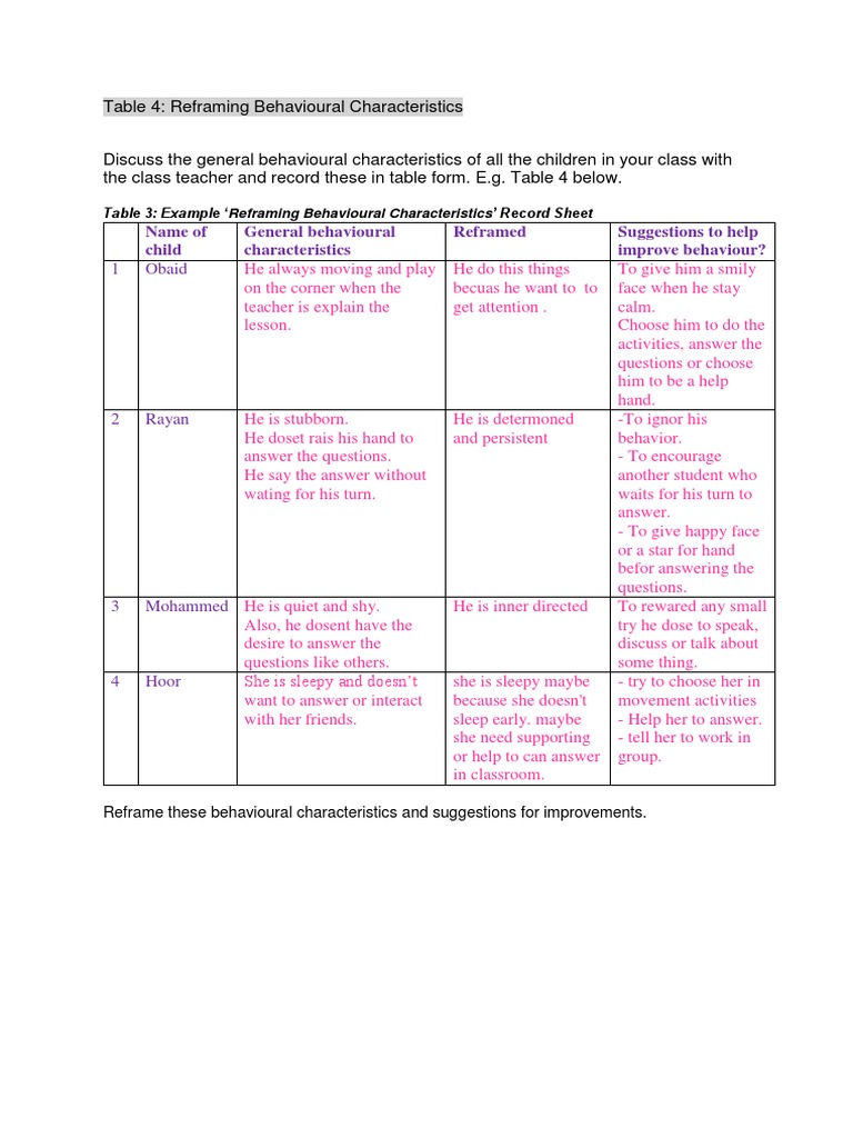 Table 4: Reframing Behavioural Characteristics
