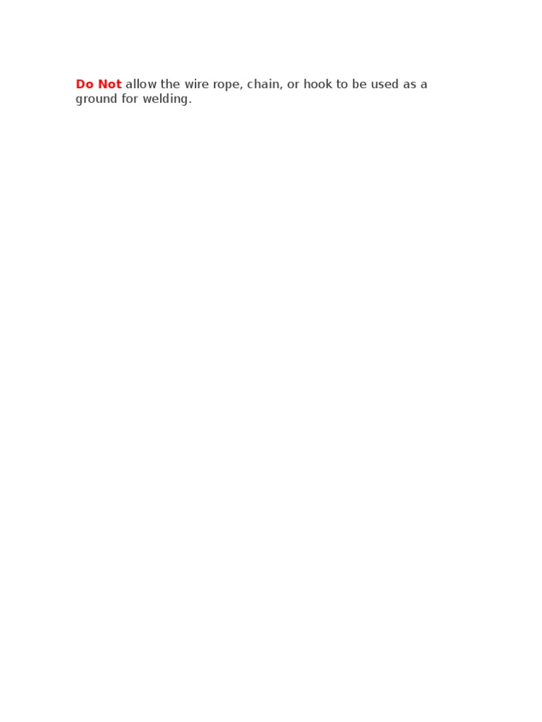 Do not use wire rope, chain, or hooks as grounds for welding as this can damage the materials and cause safety issues. Welding requires a dedicated grounding point to ensure a safe process and prevent damage to other components. Proper welding grounding avoids overheating wire rope, chain, or hooks which could fail under stress or create risk of electric shock.