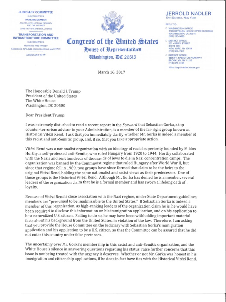 Rep. Nadler (D-NY) Calls For Investigation Into Gorka's Nazi Ties