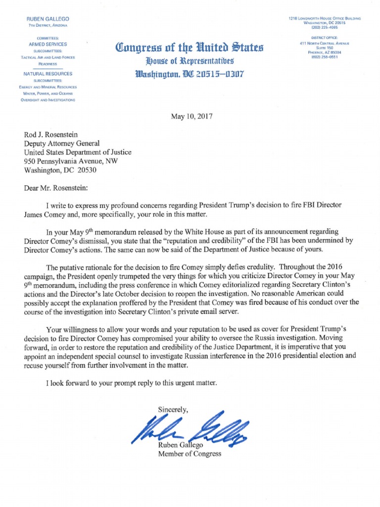 Rep. Ruben Gallego to Deputy AG Rosenstein: Appoint an independent special counsel