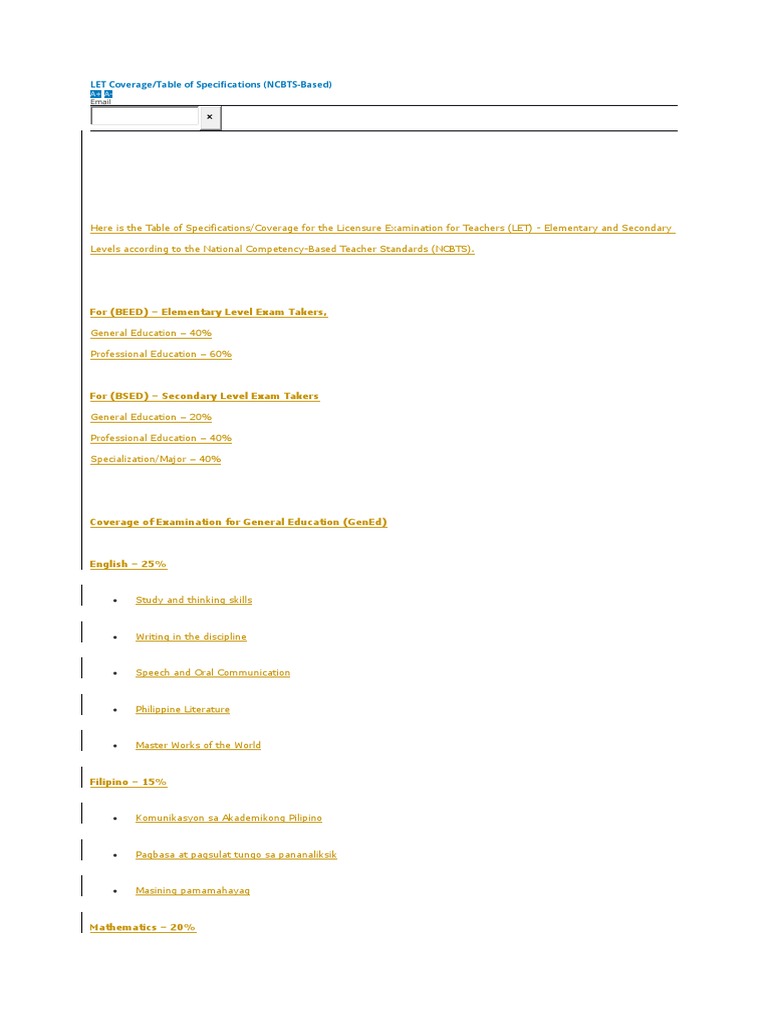 Here is the Table of Specifications/Coverage for the Licensure Examination for Teachers (LET) - Elementary and Secondary