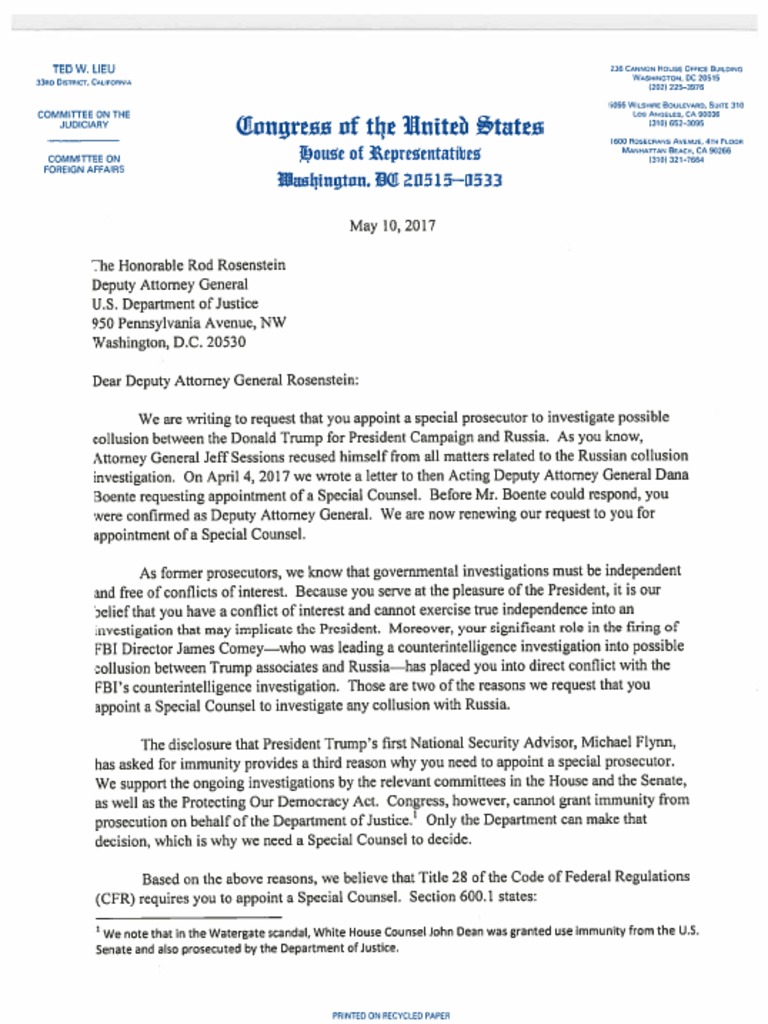 Democratic House Reps. Letter To Deputy AG Demanding Special Prosecutor