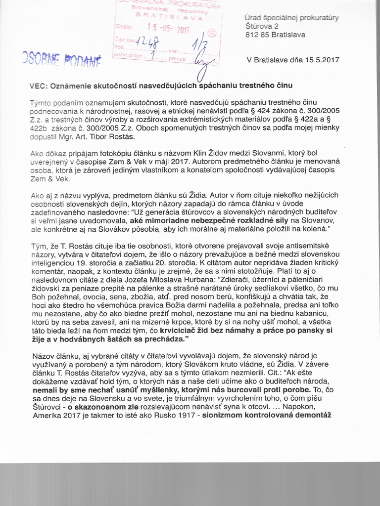 Vydavateľ magazínu Zem & Vek Tibor Rostás uverejnil v májovom čísle vlastný článok s názvom Klin Židov medzi Slovanmi. Nielen názvom, ale aj obsahom by dokonale zapadol do nacistického týždenníka Sturmer alebo do ľudáckeho denníka Slovák. Nie však do demokratického Slovenska v 21. storočí. Buď náš štát dokáže otvorené prejavy antisemitizmu a rasovej neznášanlivosti odhaľovať a trestať alebo si ako spoločnosť čoskoro zopakujeme tú smutnú časť našich dejín, v ktorej bolo obrovské množstvo ľudí zavraždených len preto, že sú určitej národnosti či vierovyznania. Osud tohto trestného oznámenia naznačí, ktorou cestou sa uberáme.