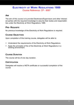 Electricity at Work Regulations 1989: Explains the core objectives of the course centered on understanding and applying the Electricity at Work Regulations from 1989.