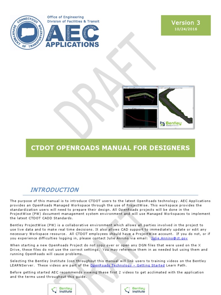 The purpose of this manual is to introduce CTDOT users to the latest OpenRoads technology . AEC Applications