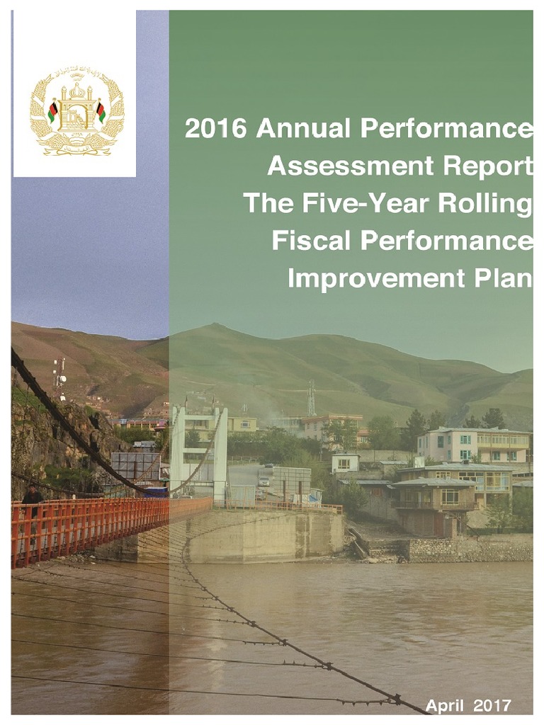 This document is the 2016 Annual Performance Assessment Report of Afghanistan's Five-Year Rolling Fiscal Performance Improvement Plan. It summarizes the key achievements and challenges in implementing reforms to improve public financial management. Some of the main achievements included progress in national procurement, revenue collection, and customs. However, major challenges remained in the budget process, as planned reforms to establish a credible medium-term expenditure framework were not achieved. The report also includes league tables ranking the performance of different departments, with the National Procurement Authority, Treasury, and Revenue identified as the top performers. It concludes that while a performance culture is emerging, continued progress will require addressing ongoing challenges in leadership, planning, external support, and driving behavioral changes.