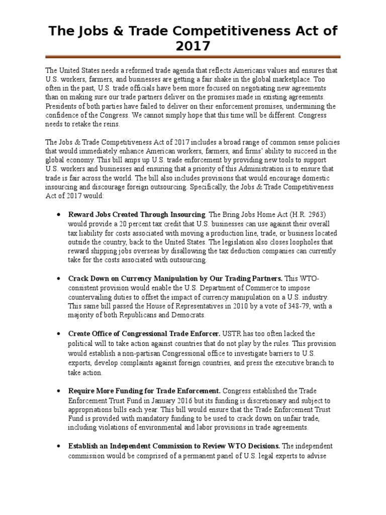 U.S. Representative Bill Pascrell, Jr. (NJ-09), Ranking Democrat on the House Ways and Means Trade Subcommittees, announced the introduction of the Jobs & Trade Competitiveness Act. Cosponsors include Reps. Sander Levin (D-MI), Linda Sanchez (D-CA), Brian Higgins (D-NY), Terri Sewell (D-AL), Suzan DelBene (D-WA), and Judy Chu (D-CA). [May 26, 2017]