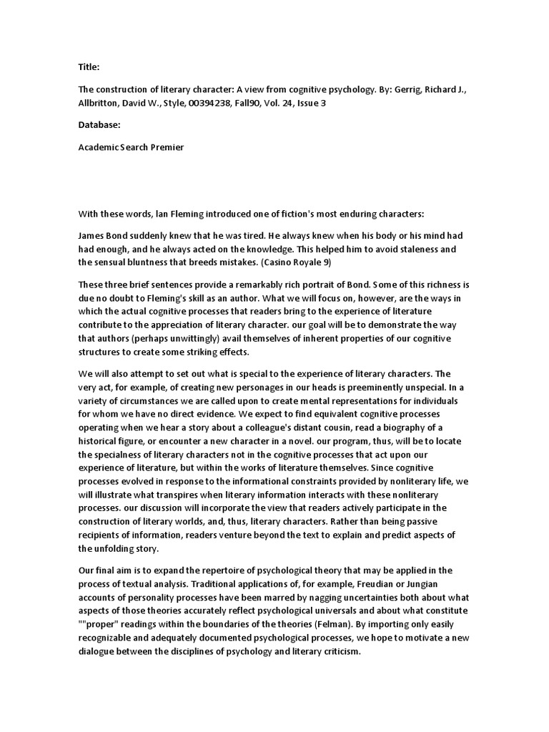 The construction of literary character: A view from cognitive psychology. By: Gerrig, Richard J.,