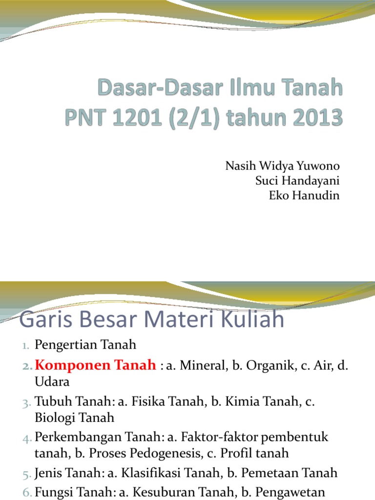 2. Komponen Tanah : a. Mineral, b. Organik, c. Air, d.