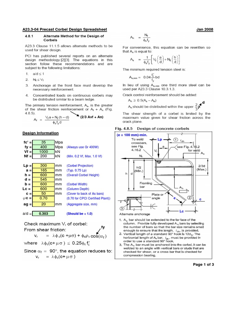 A23.3-04 Precast Corbel Design Spreadsheet Jan 2008