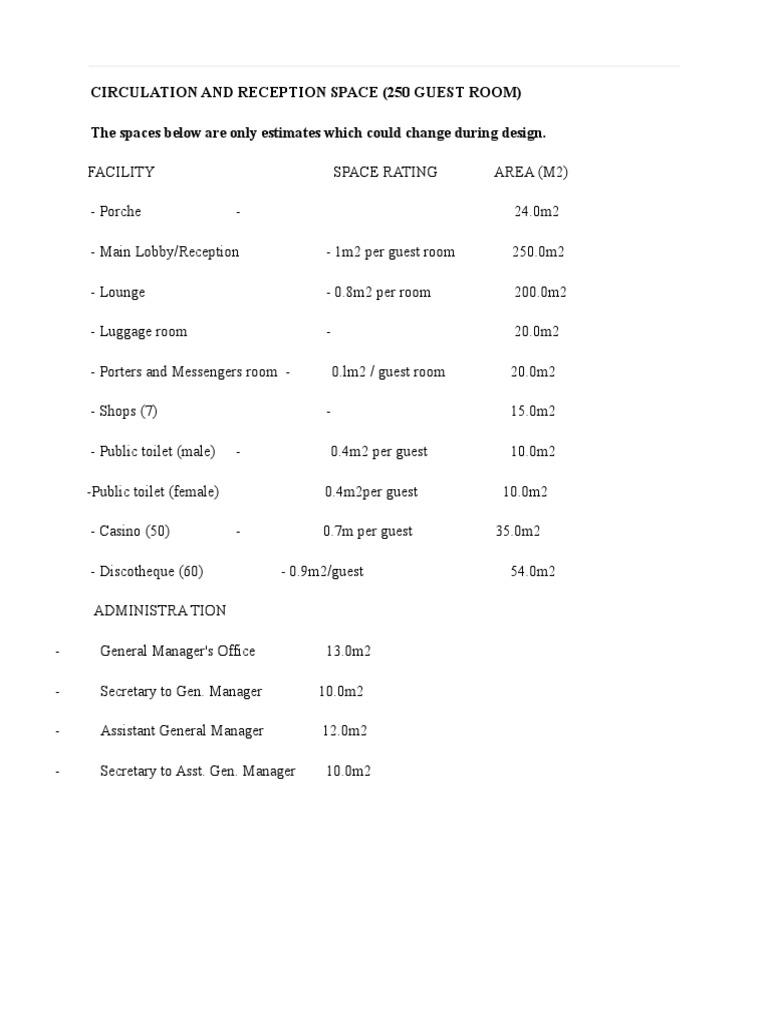 - Main Lobby/Reception - 1m2 per guest room 250.0m2