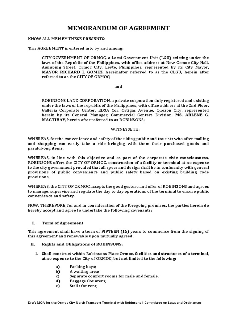 Draft MOA for the Ormoc City North Transport Terminal with Robinsons | Committee on Laws and Ordinances