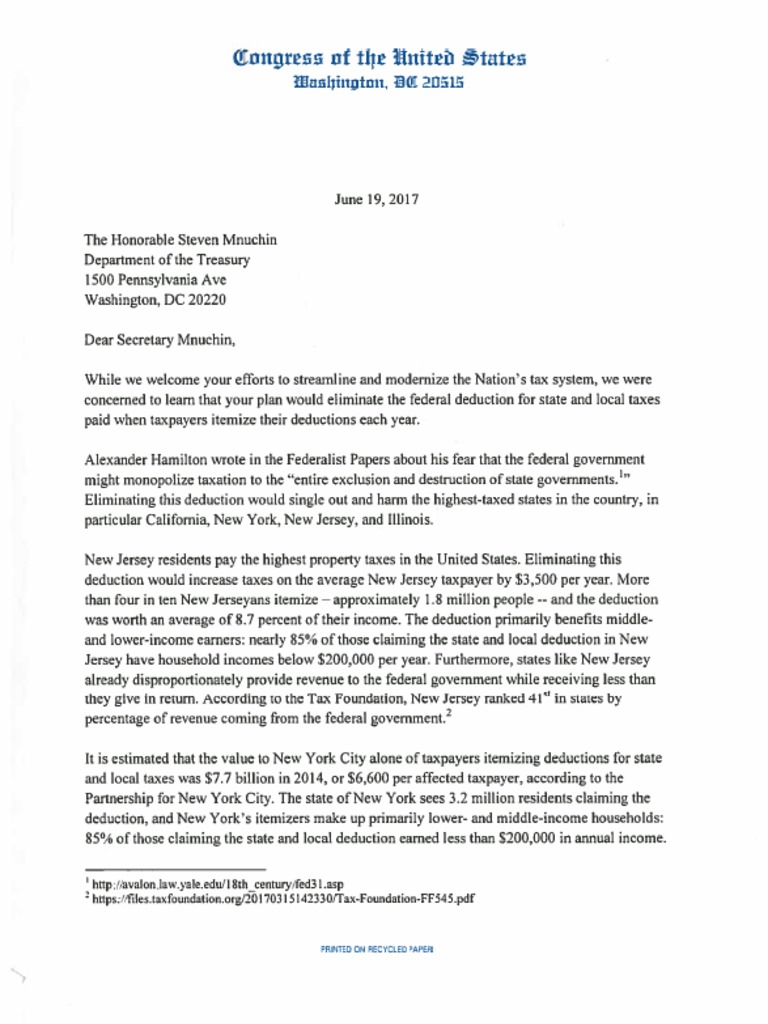 U.S. Representative Bill Pascrell, Jr. (D-NJ), a member of the House Ways and Means Committee, and U.S. Representative Leonard Lance (R-NJ) led a bipartisan letter with 68 colleagues to Secretary of Treasury Steve Mnuchin protesting the Administration’s plan to eliminate the federal deduction for state and local taxes. The elimination of this deduction would be especially detrimental to high-tax states like New Jersey, California, New York, and Illinois.