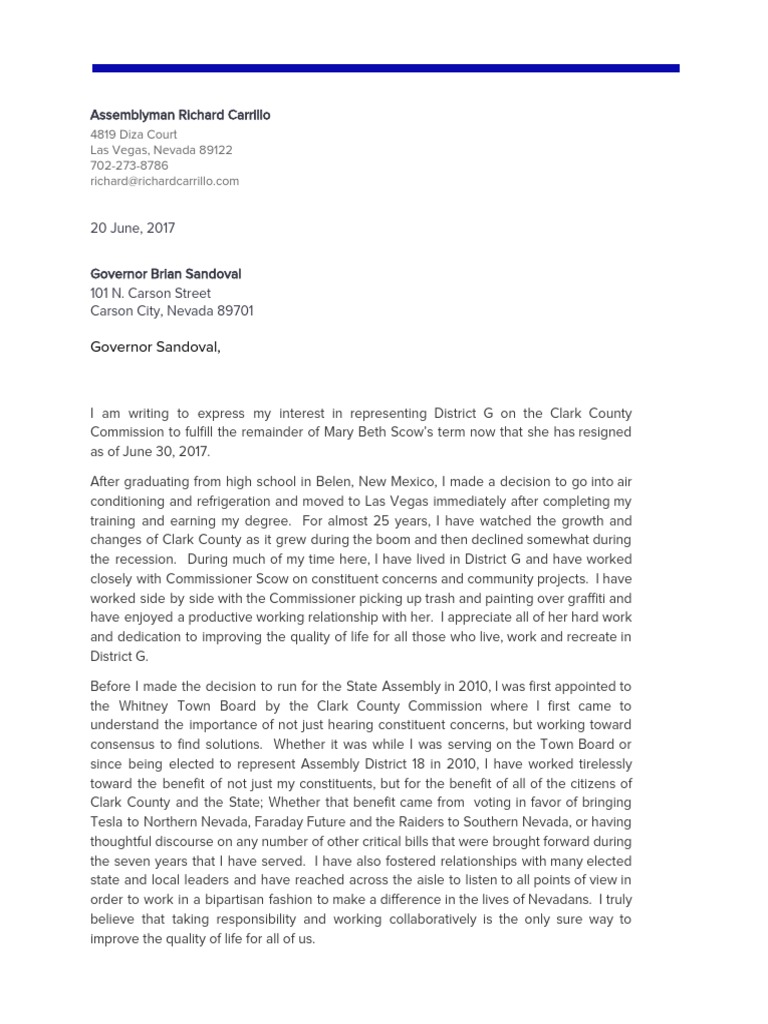 I am writing to express my interest in representing District G on the Clark County Commission to fulfill the remainder of Mary Beth Scow’s term now that she has resigned as of June 30, 2017. After graduating from high school in Belen, New Mexico, I made a decision to go into air conditioning and refrigeration and moved to Las Vegas immediately after completing my training and earning my degree. For almost 25 years, I have watched the growth and changes of Clark County as it grew during the boom and then declined somewhat during the recession. During much of my time here, I have lived in District G and have worked closely with Commissioner Scow on constituent concerns and community projects. I have worked side by side with the Commissioner picking up trash and painting over graffiti and have enjoyed a productive working relationship with her. I appreciate all of her hard work and dedication to improving the quality of life for all those who live, work and recreate in District G. Before I made the decision to run for the State Assembly in 2010, I was first appointed to the Whitney Town Board by the Clark County Commission where I first came to understand the importance of not just hearing constituent concerns, but working toward consensus to find solutions. Whether it was while I was serving on the Town Board or since being elected to represent Assembly District 18 in 2010, I have worked tirelessly toward the benefit of not just my constituents, but for the benefit of all of the citizens of Clark County and the State; Whether that benefit came from voting in favor of bringing Tesla to Northern Nevada, Faraday Future and the Raiders to Southern Nevada, or having thoughtful discourse on any number of other critical bills that were brought forward during the seven years that I have served. I have also fostered relationships with many elected state and local leaders and have reached across the aisle to listen to all points of view in order to work in a bipartisan fashion to make a difference in the lives of Nevadans. I truly believe that taking responsibility and working collaboratively is the only sure way to improve the quality of life for all of us.