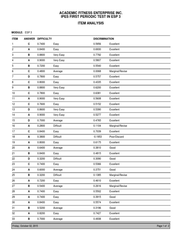 ITEM ANSWER DIFFICULTY DISCRIMINATION