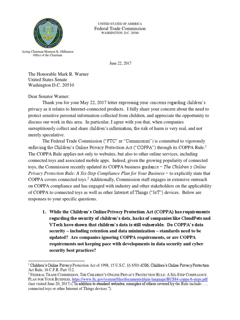 privacy as it relates to Internet-connected products. I fully share your concern about the need to protect sensitive personal information collected from children, and appreciate the opportunity to discuss our work in this area. In particular, I agree with you that, when companies surreptitiously collect and share