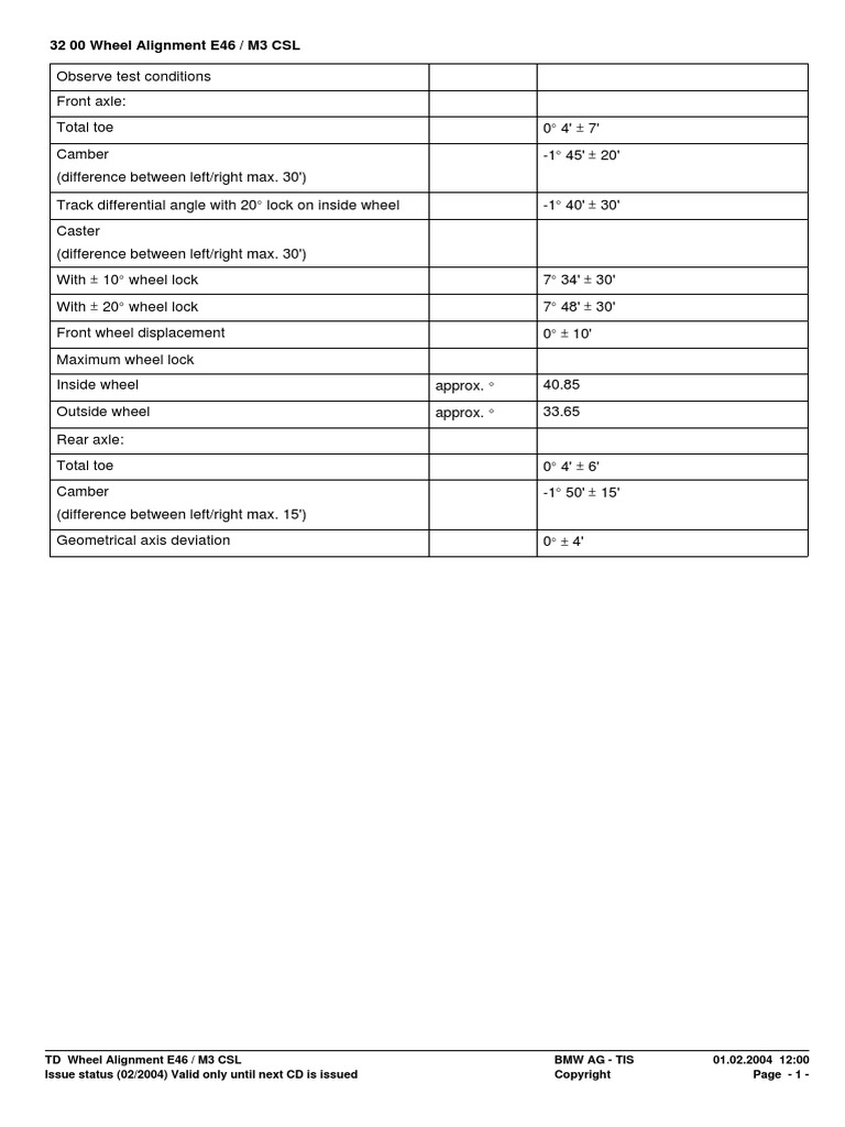 TD Wheel Alignment E46 / M3 CSL BMW AG - TIS 01.02.2004 12:00