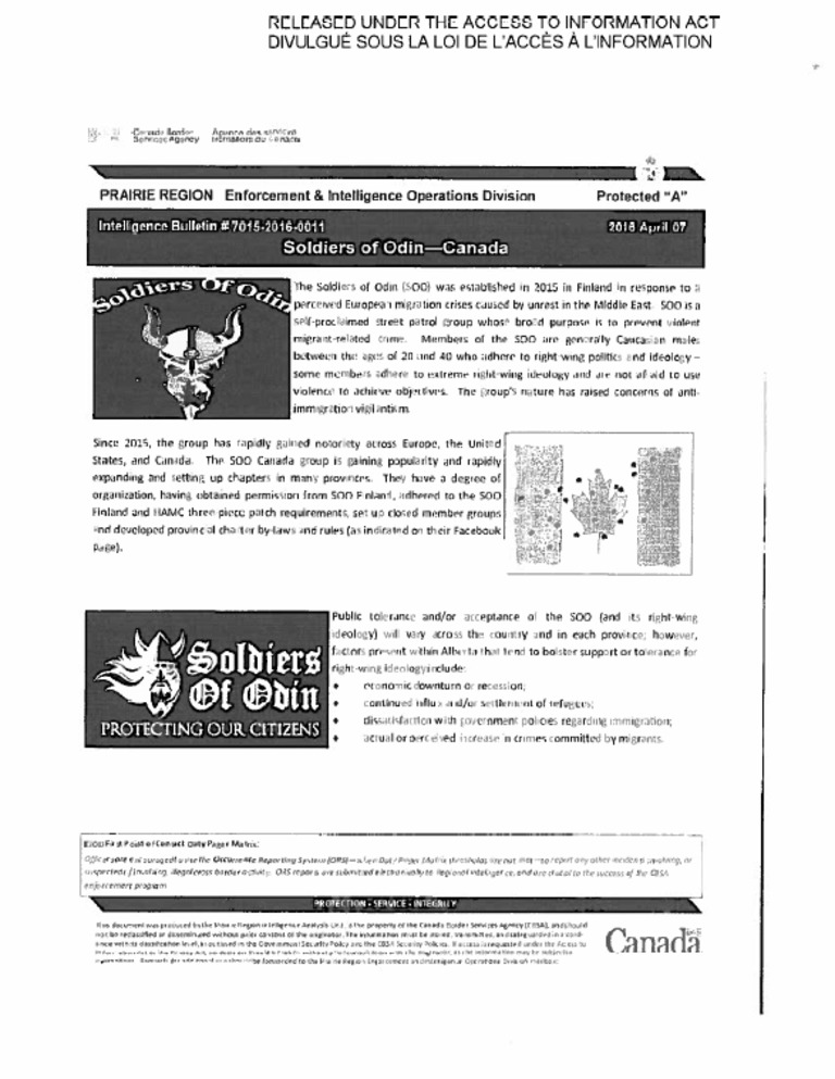 Canada Border Services Agency Intelligence Bulletin on the spread of the far-right group Soldiers of Odin-Canada.